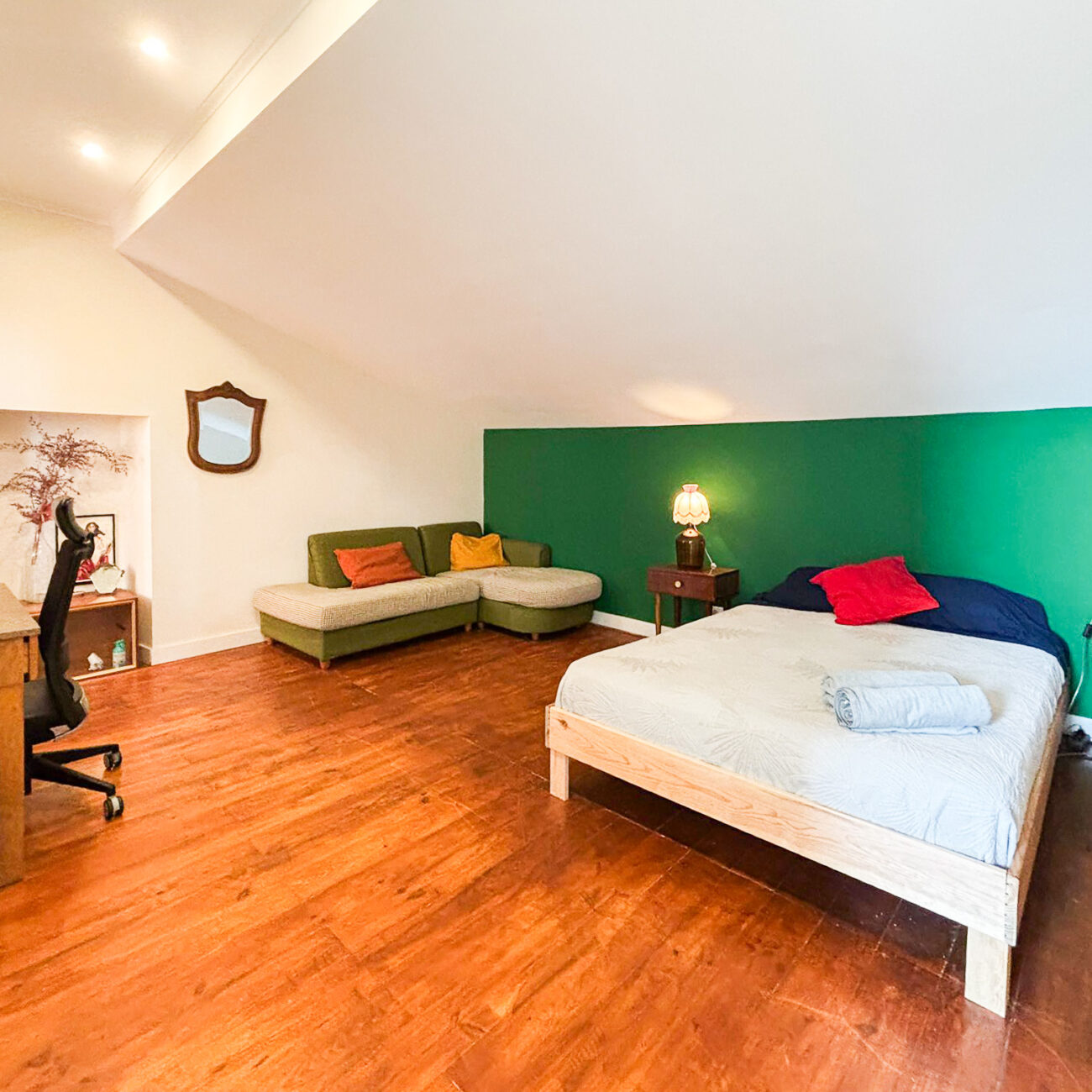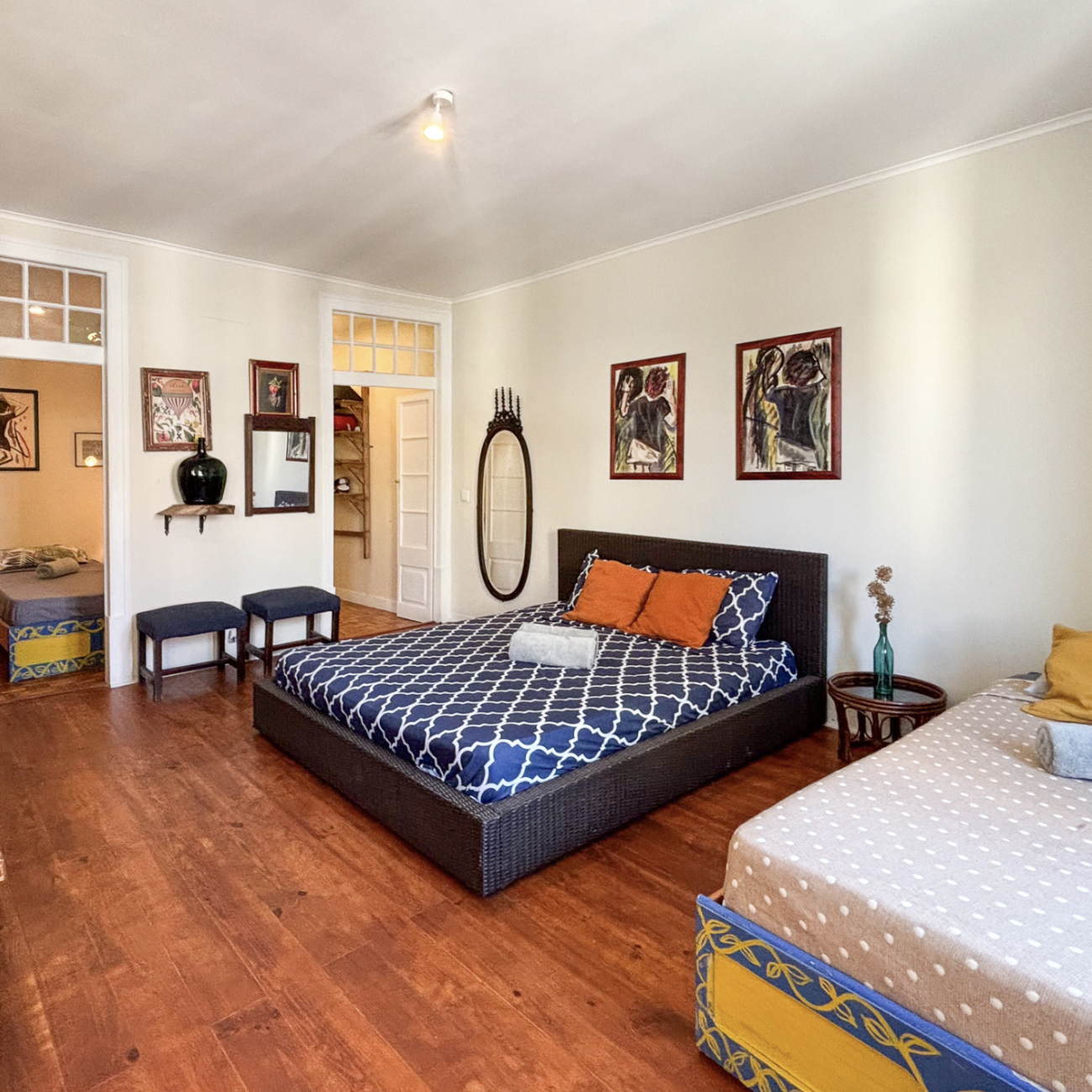 The Boho Chic Suite is a bright and spacious room that effortlessly blends comfort with eclectic style. Designed for up to four guests, this suite offers a mix of one double bed and two single beds, making it ideal for families or groups. The decor is a captivating blend of rustic elements and colorful art pieces that add character and warmth to the space.